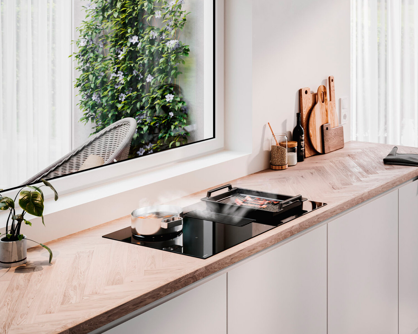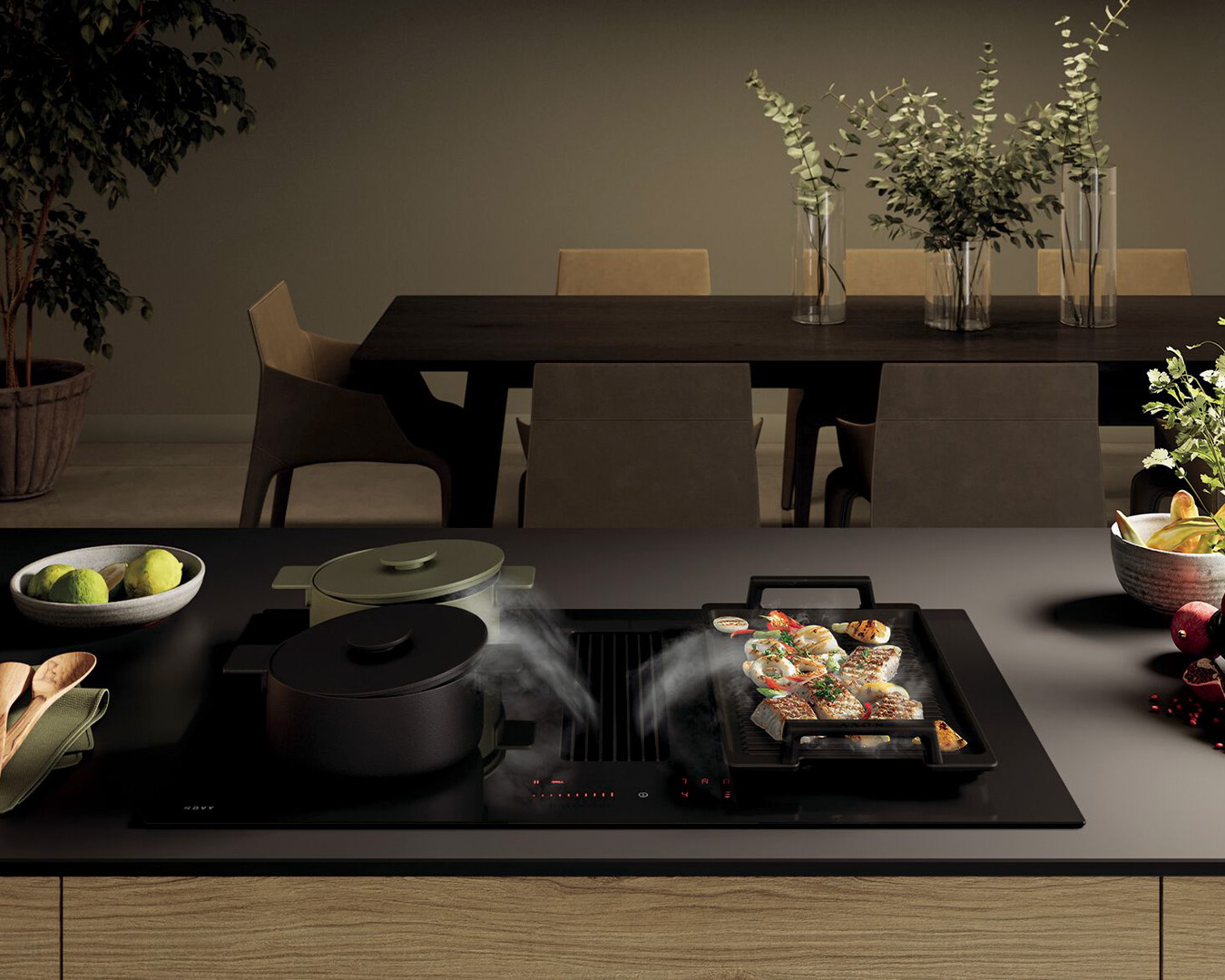 Bordemfang giver en alt-i-én-følelse med en emhætte indbygget i kogepladen eller integreret i bordpladen med en emhætte bag varmezonerne. Vi har løsningen, der passer til dig, uanset hvilken type emhætte du ønsker.