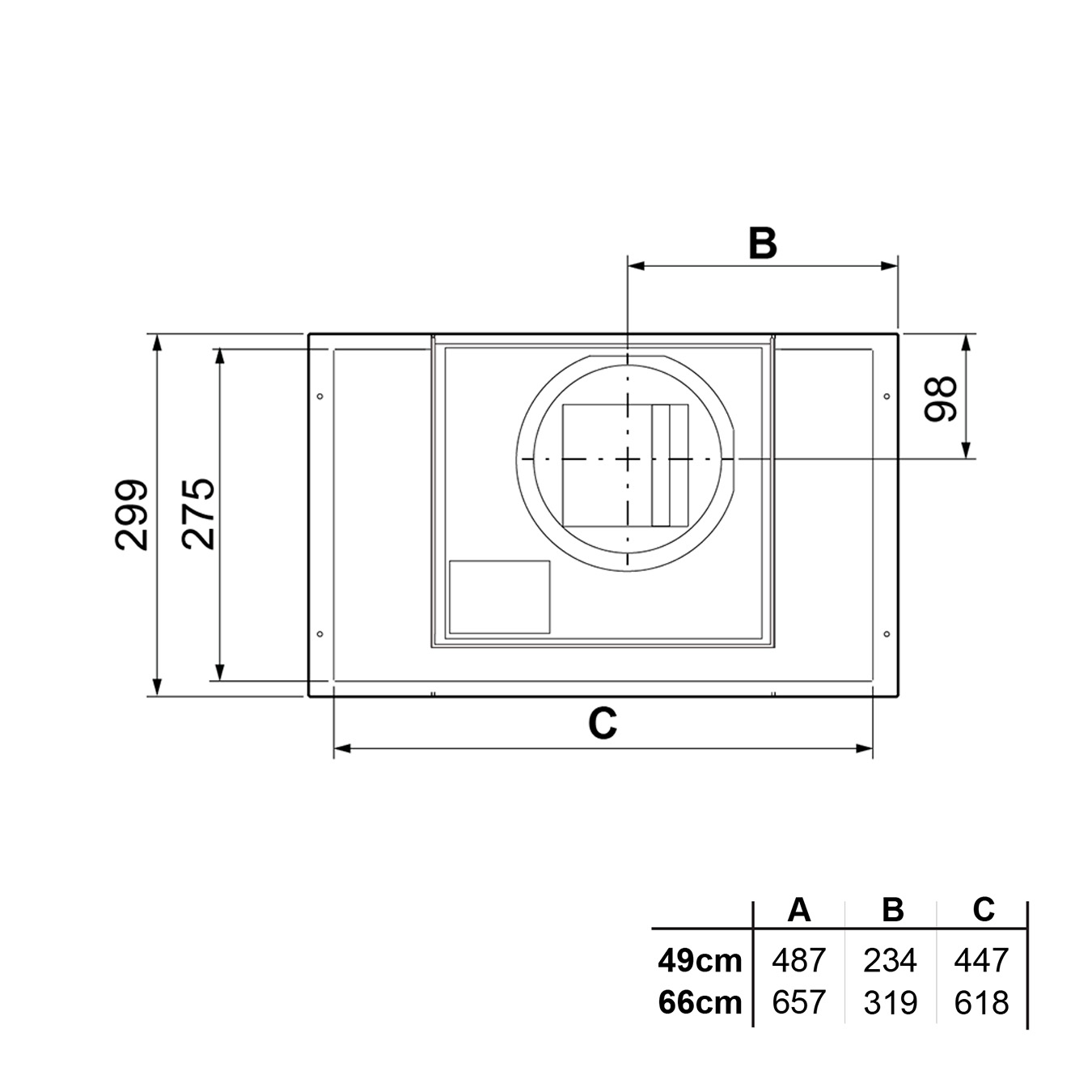 Udskæringsmål for indsats med bredde 48,7 cm er 449 x 293 mm.