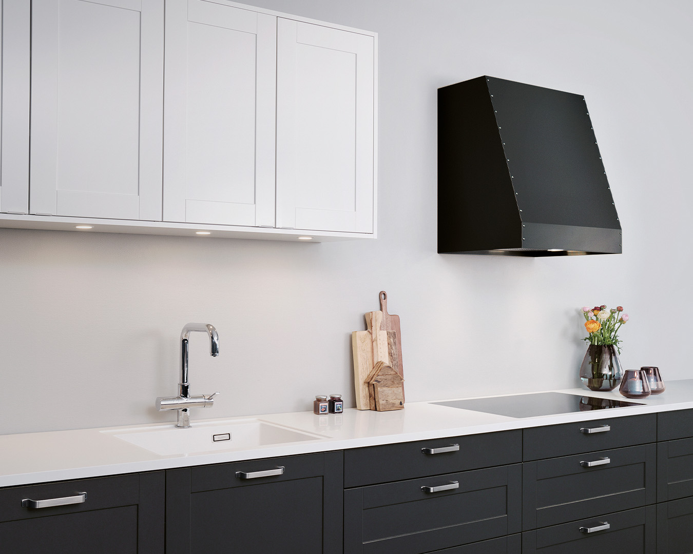 Stil kan leveres til alle ventilationstyper, har en hævet bundplade for optimal røgopsamling og kan leveres med Sense integreret komfurvagt.