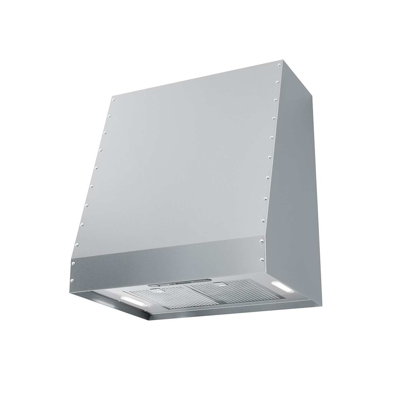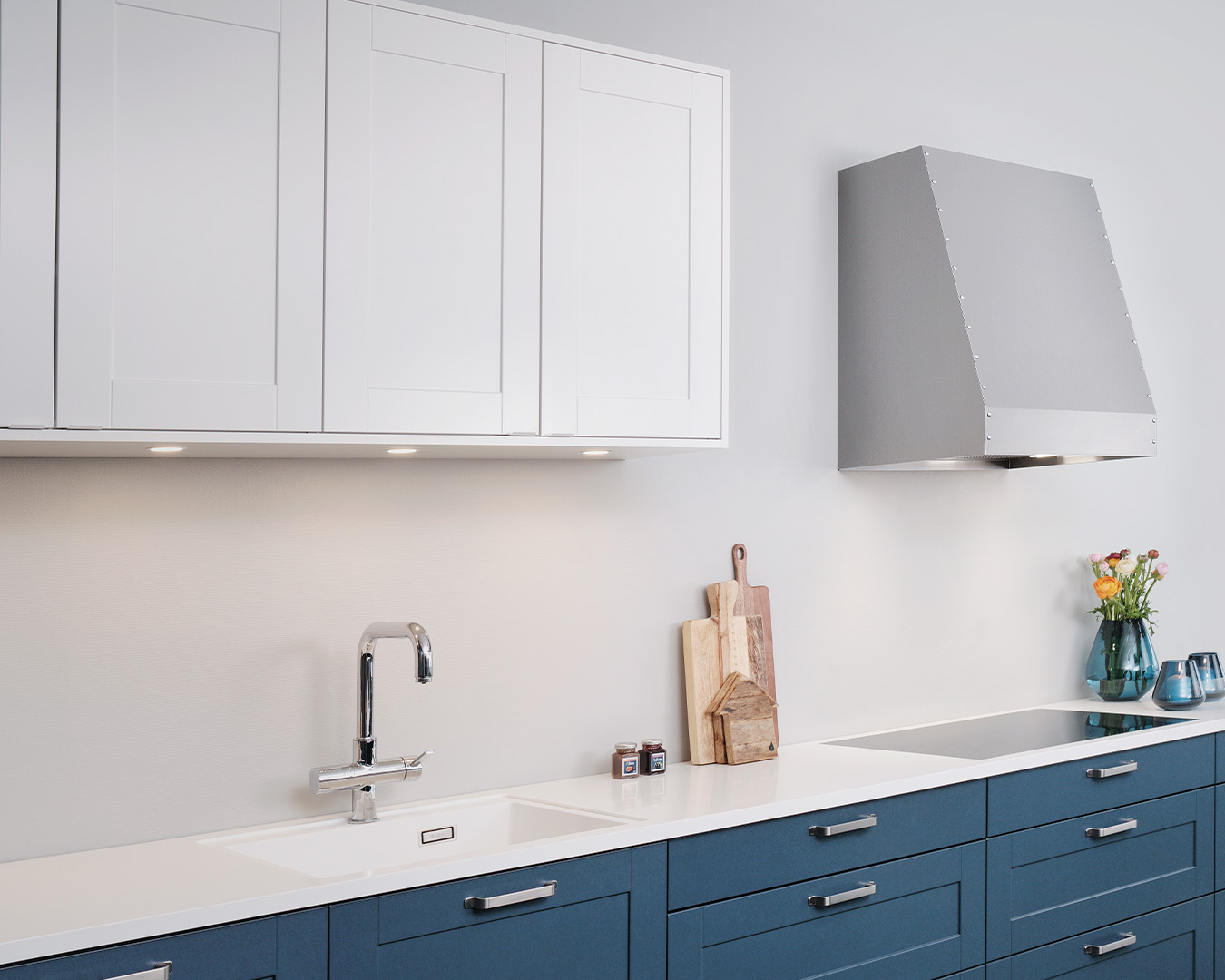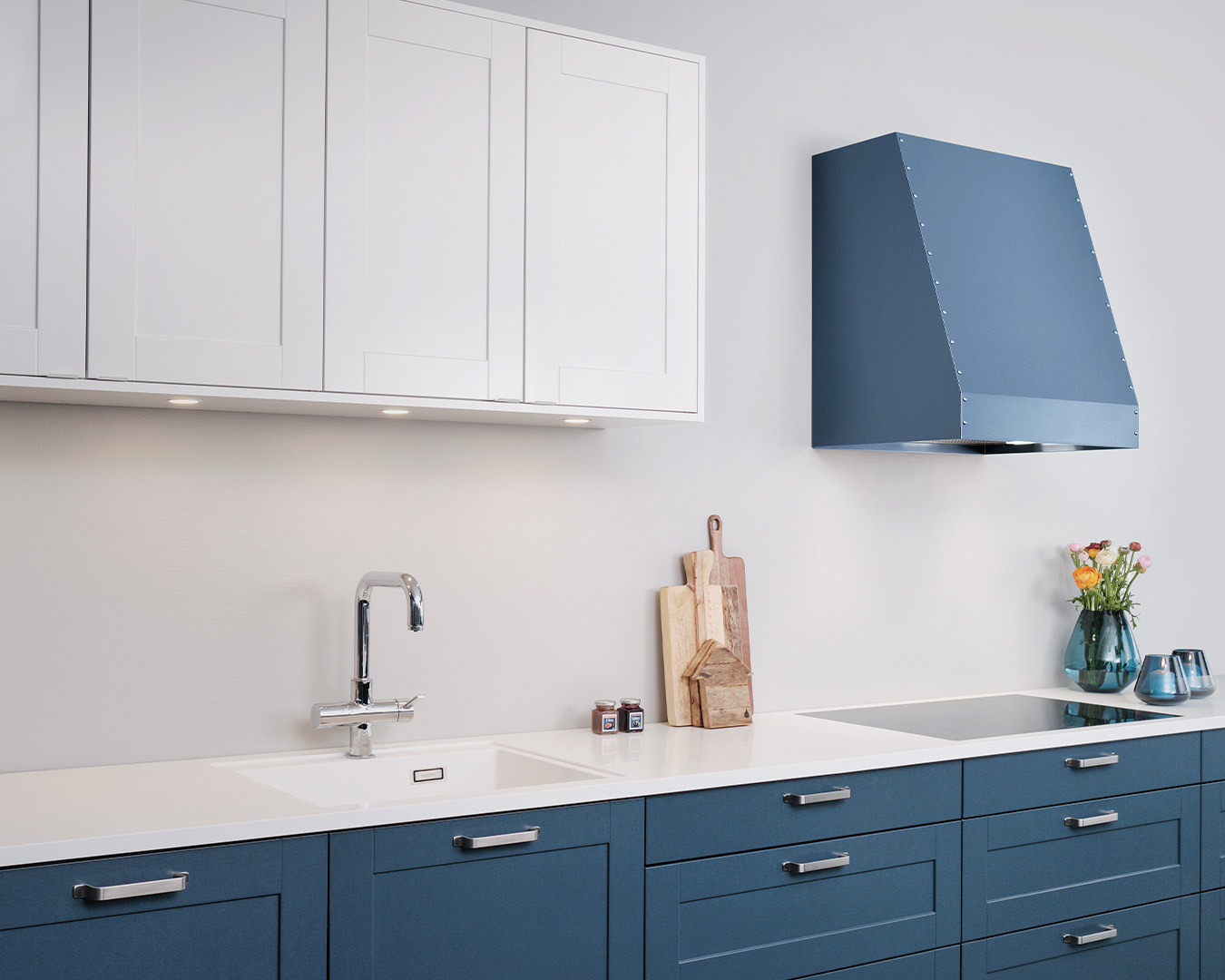 Køkkenemhætten kan leveres i enhver lakeret farve eller valgfri PVD-metal i børstet eller højglans finish.