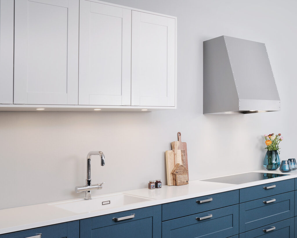 Stil Sense vægmonteret køkkenemhætte leveres som standard i 60 cm bredde, men den kan også tilpasses op til 200 cm!