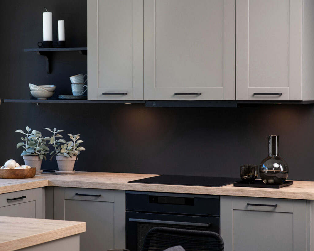 Most people place the cooking zone against a wall in the kitchen. This often simplifies the ducting from the kitchen hood to the open air, either directly through the wall behind or directly through the ceiling. Now the kitchen hood is also often connected to external motors or units that are located away from the kitchen. Installing straight wall hoods is very easy. The distance between the hood and the hob should be from 50–70 cm. For a gas stove, a minimum of 65 cm.
