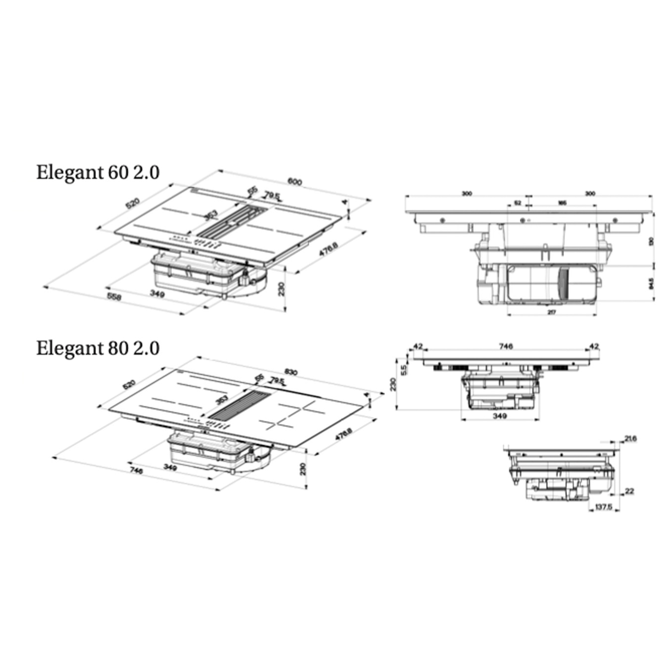 Elegant 2.0 is an all-in-one hob and hood that boasts a sleek and slim design, leaving plenty of cabinet space. Its powerful bridging cooking zones and moisture-extracting recirculation feature makes it a functional and convenient choice for any kitchen. The intuitive controls allow for easy operation, while the quiet motor ensures minimal noise. The Elegant combohob also features easy-to-clean features for a comfortable and hassle-free cooking experience.