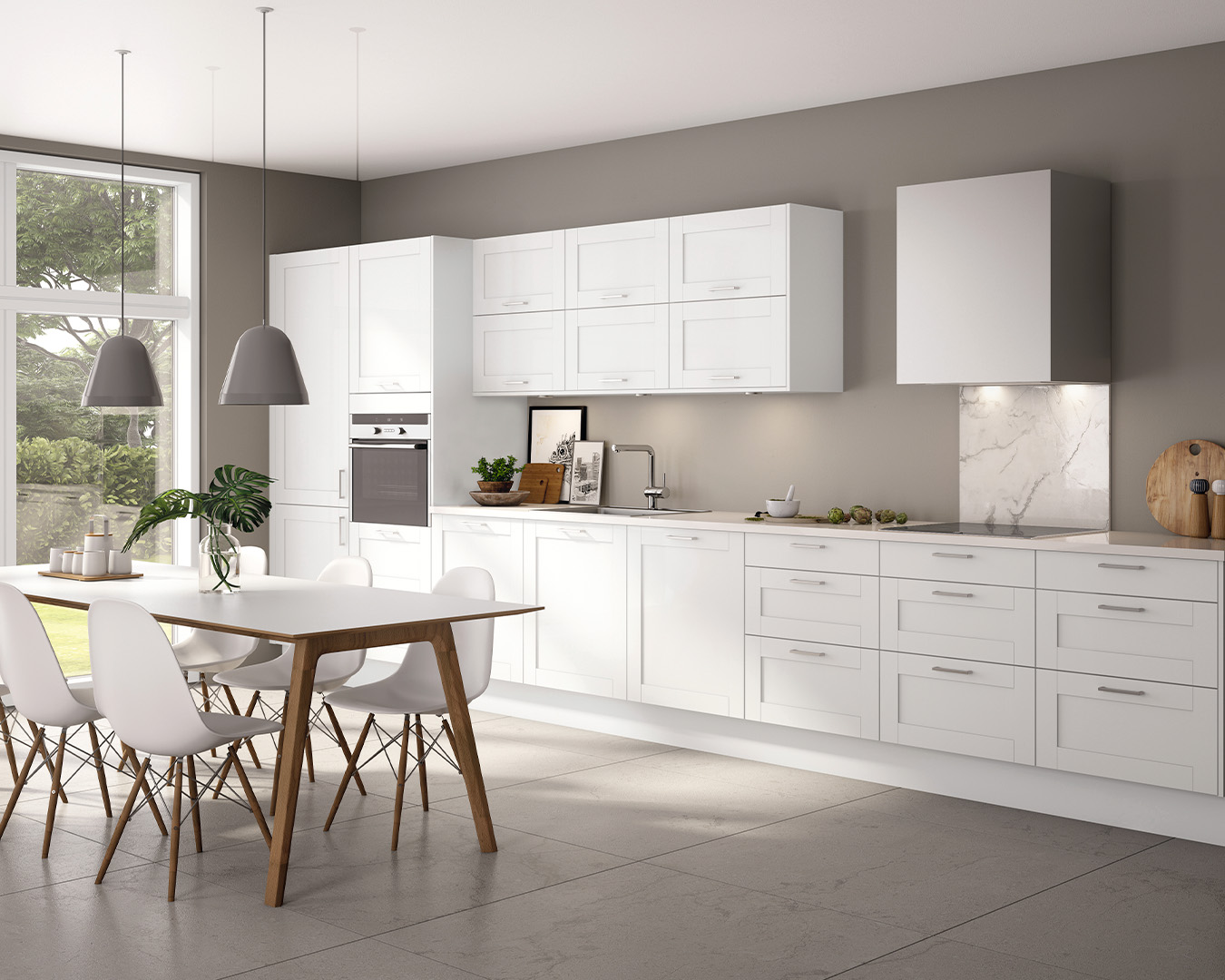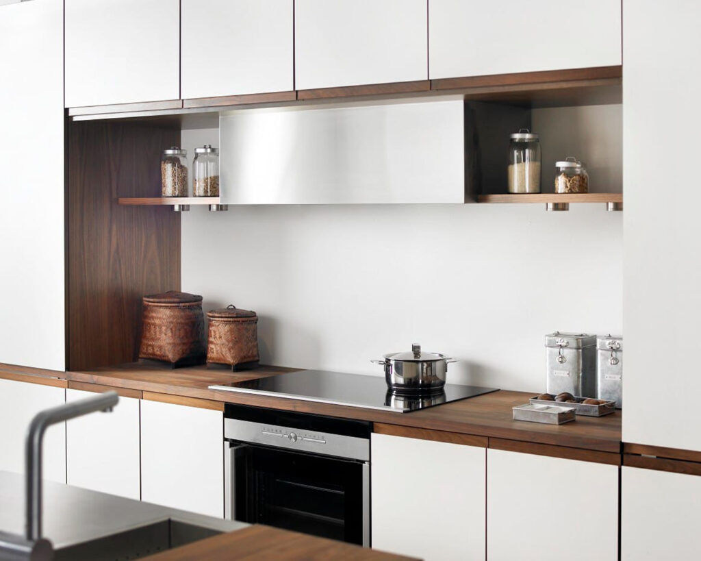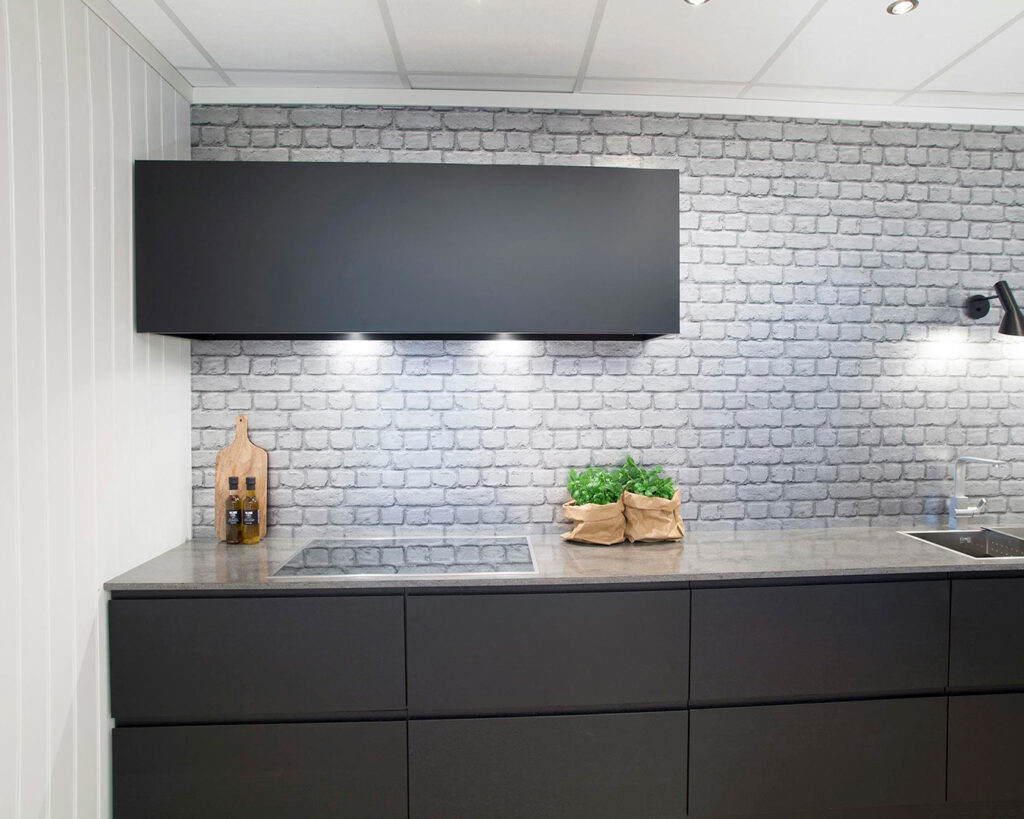 Most people place the cooking zone against a wall in the kitchen. This often simplifies the ducting from the kitchen exhaust fan to the open air, either straight through the wall behind or straight through the ceiling. Now the kitchen exhaust fan is also often connected to external motors or units that are placed away from the kitchen. Installing straight wall hoods is very easy. The distance between the hood and the hob should be from 50–70 cm. For a gas stove, a minimum of 65 cm.