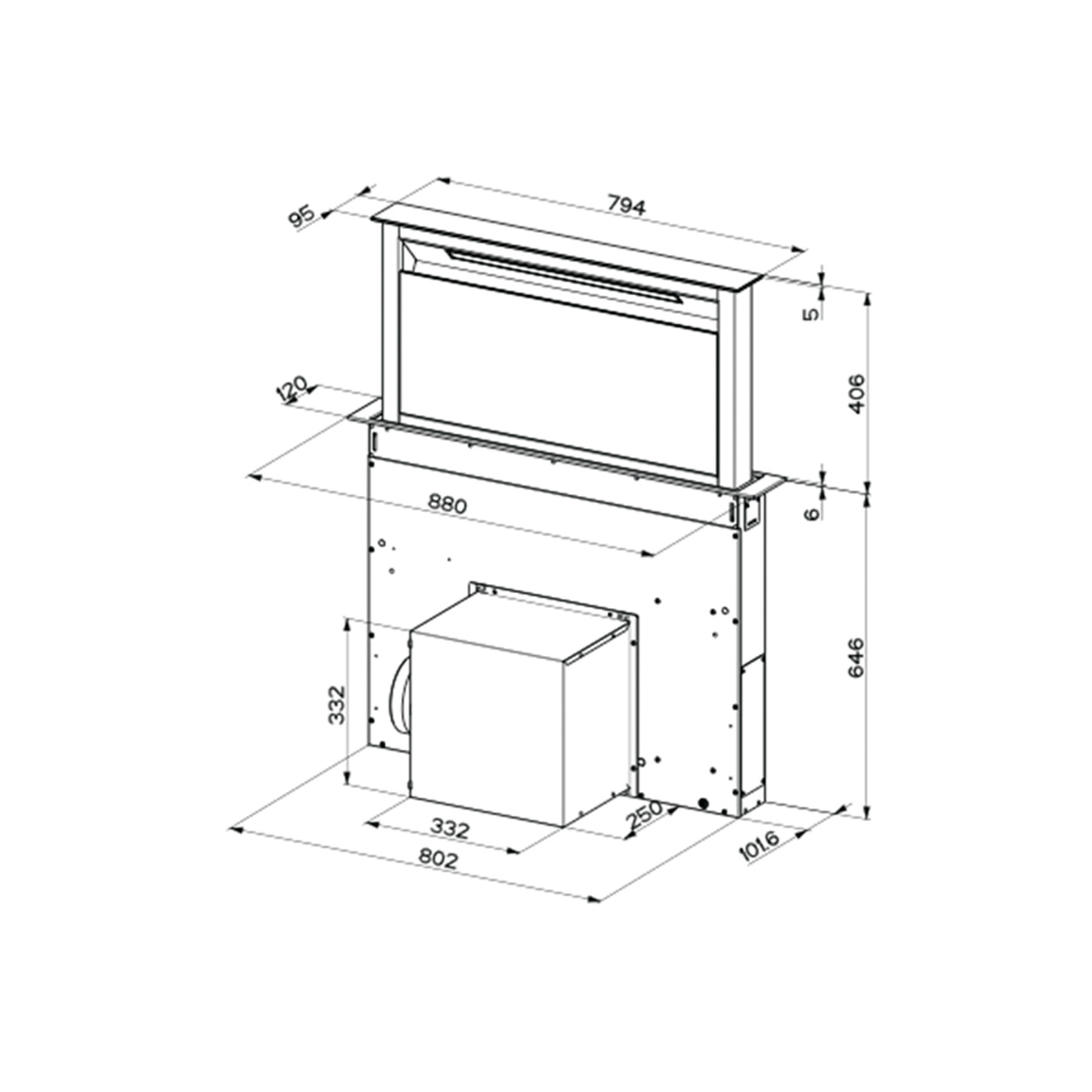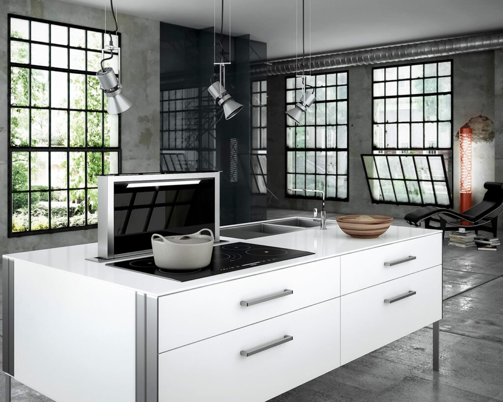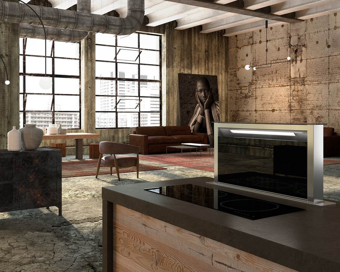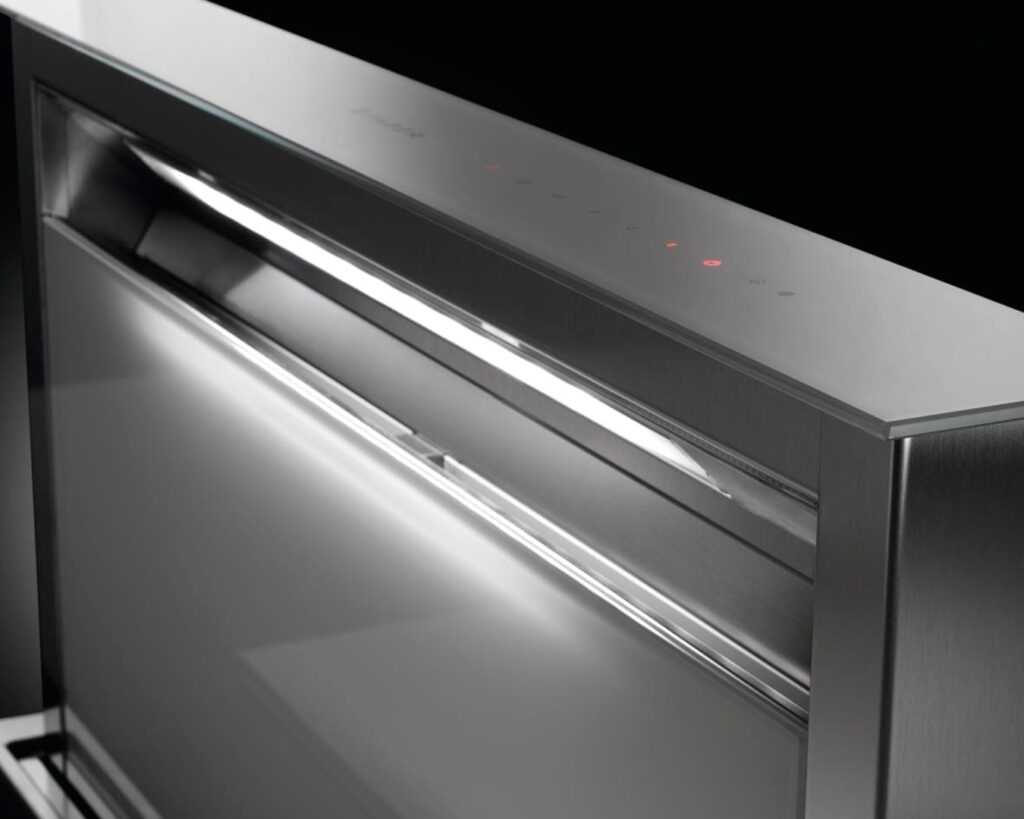 Fabula er en eksklusiv benkeventilator som gir deg nye muligheter på kjøkkenet. Den elektroniske hev-/senkfunksjonen gjør at ventilatoren skjules i kjøkkenøya når du ikke lager mat.