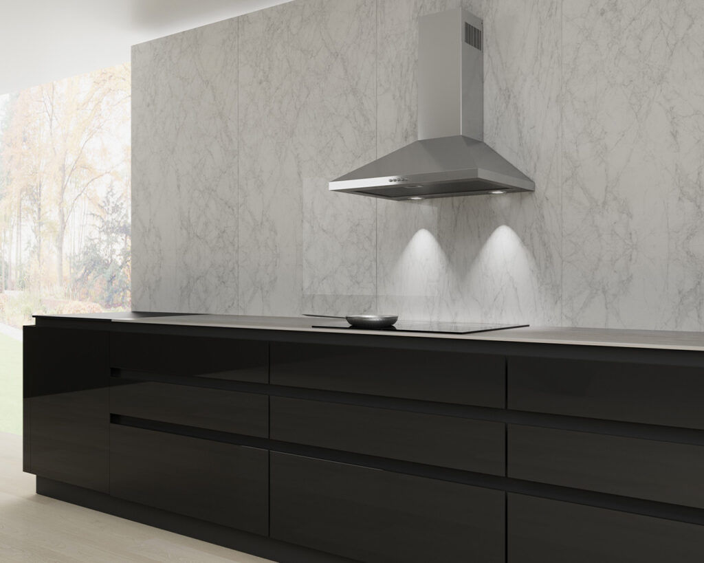Du får Neo kjøkkenhette i både 60 og 90 cm bredde. Kjøkkenhettens stål-utførelse tar seg like godt ut i mørke, som i lyse kjøkken og sikrer en tidlig «finish» på kjøkkenet ditt.