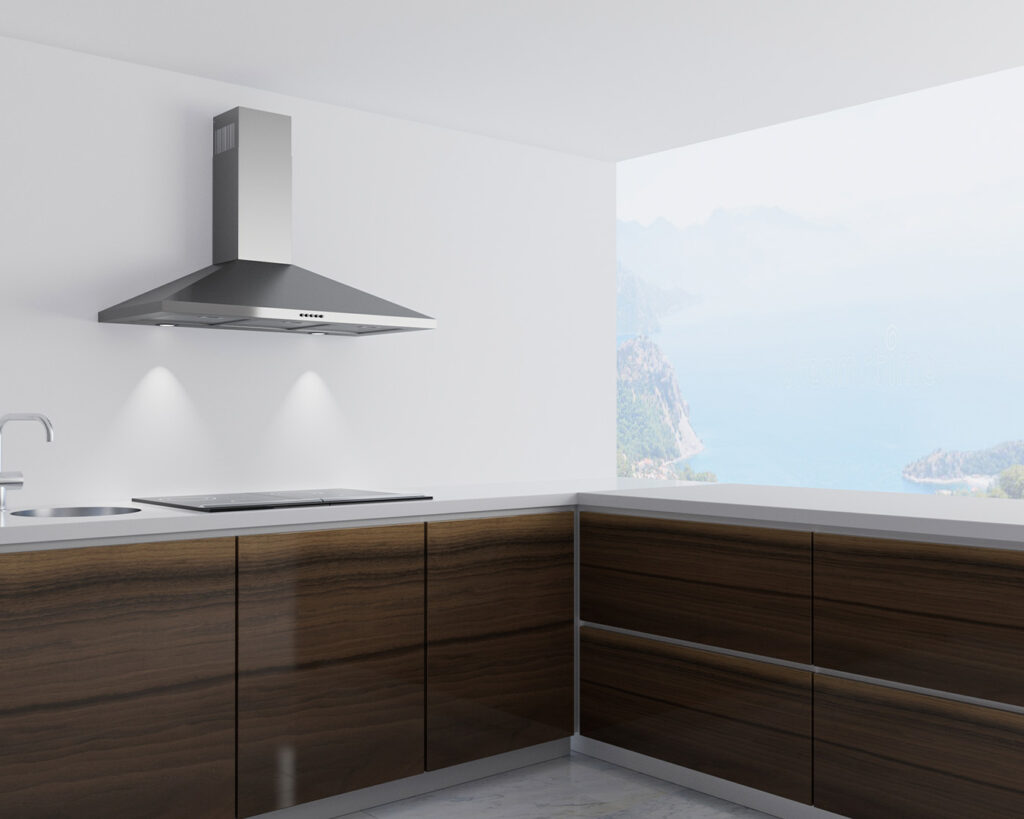 Neo er en tradisjonsrik og klassisk vegghengt kjøkkenhette i rustfritt stål, som glir elegant inn i mange interiør.
