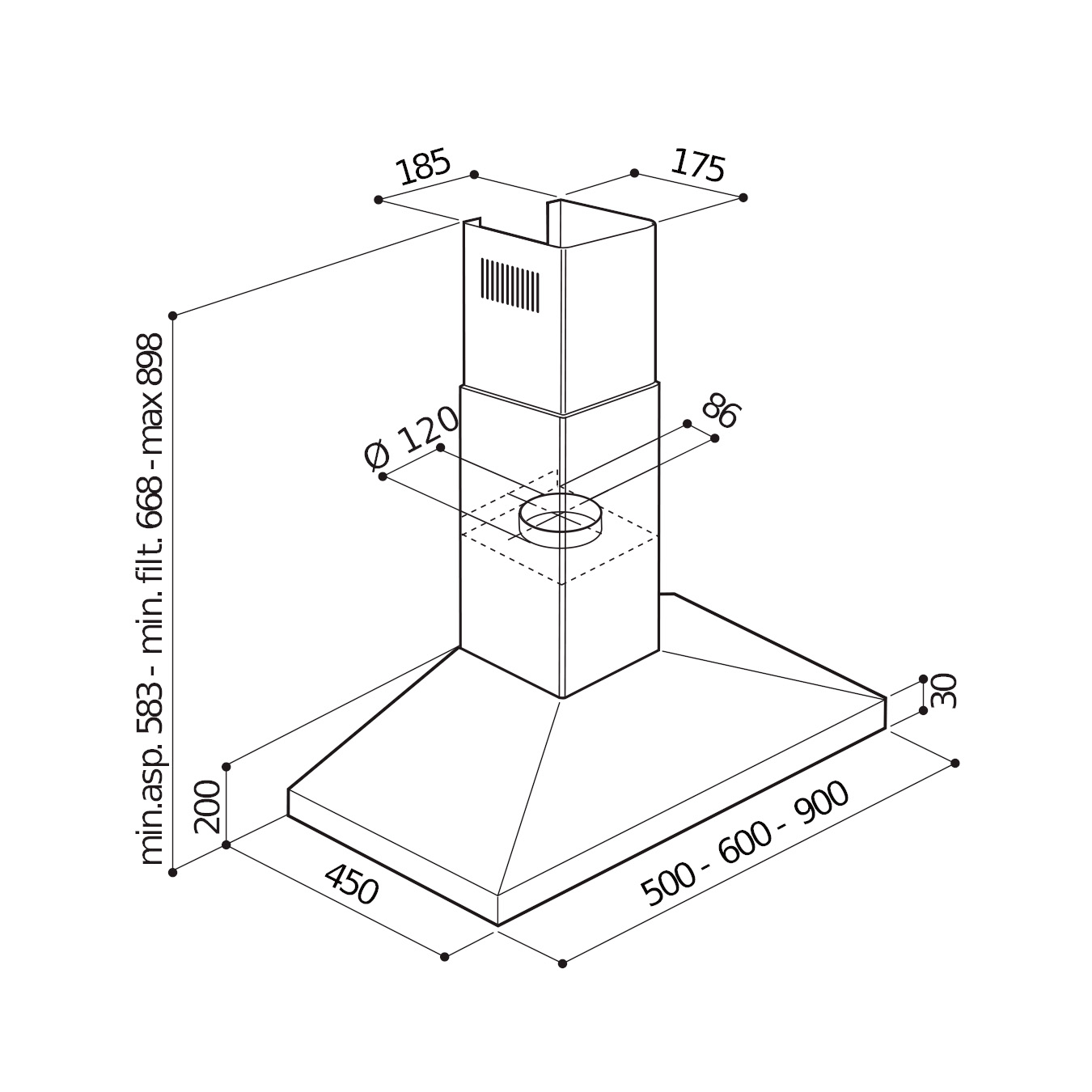 Kjøkkenhettens total høyde kan være fra 58,3–89,8 cm med teleskopisk kanal.