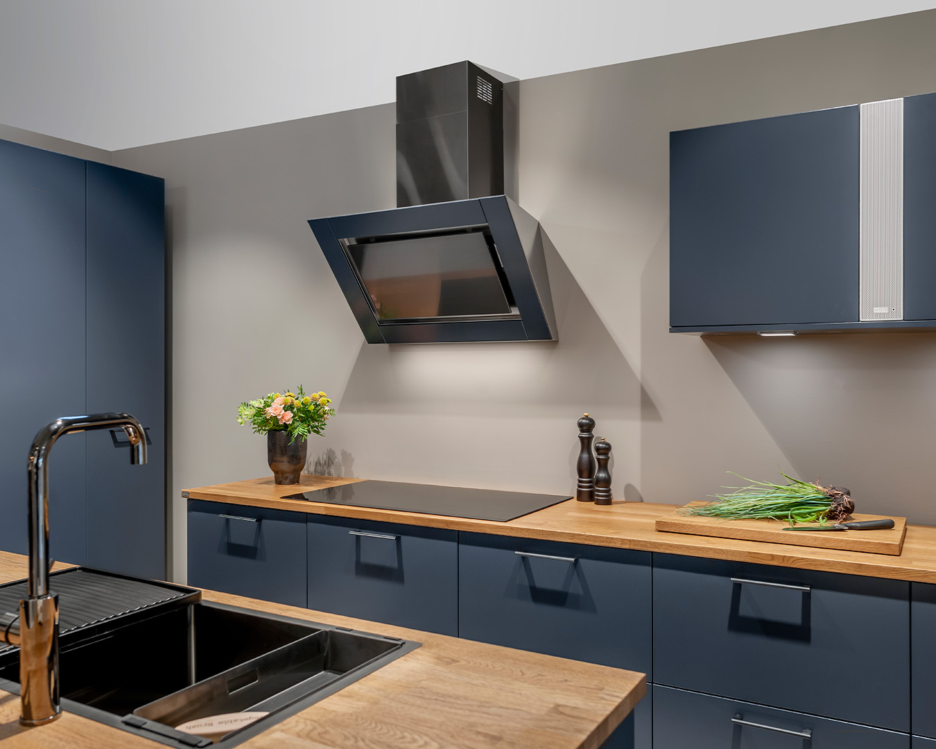 Skråstilt kjøkkenhette tilbyr effektivt os oppfang og lavt støynivå, men er vinklet slik at man får bedre innsyn over platetoppen, og sjansen for å dunke hodet i produktet reduseres betraktelig.